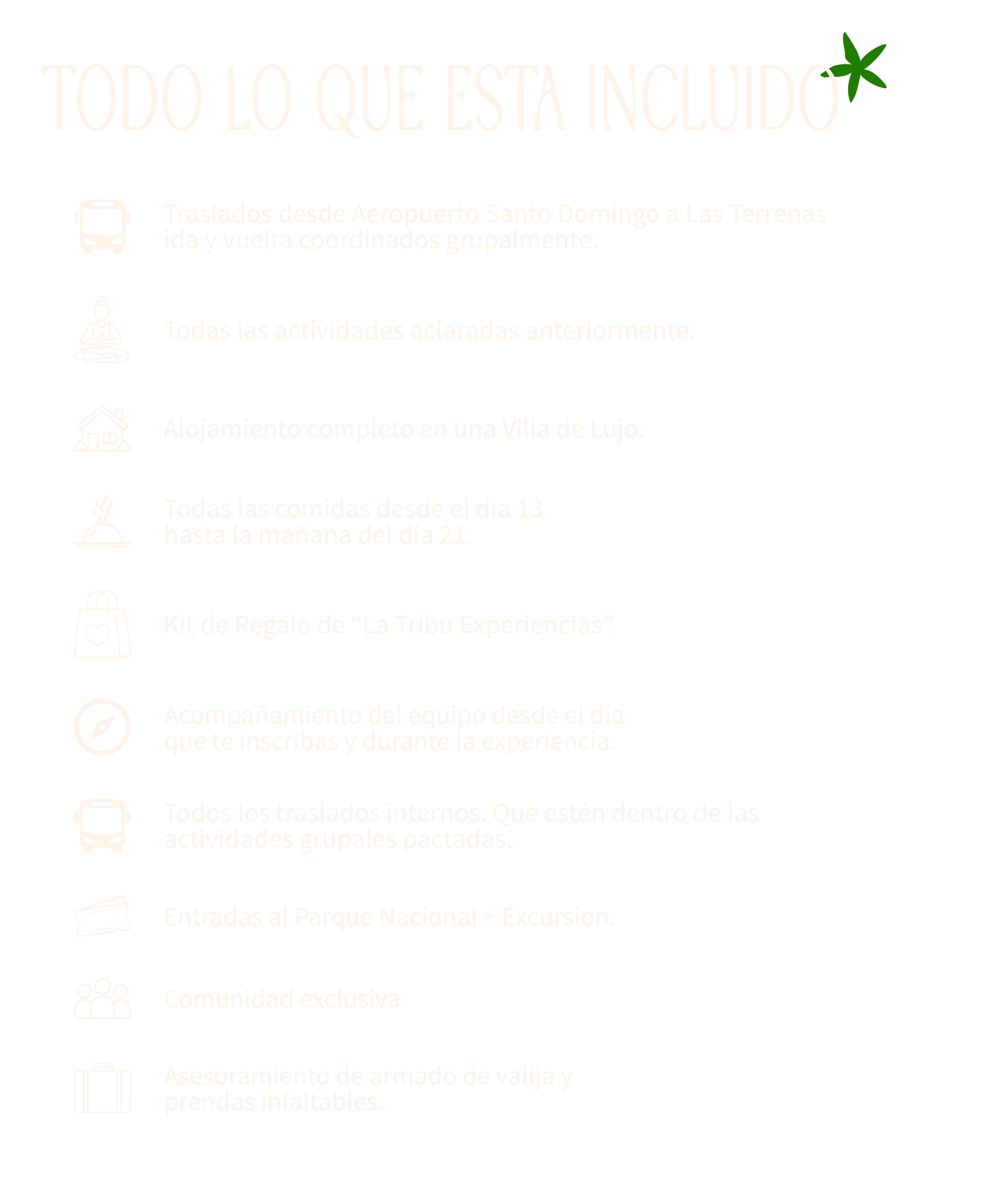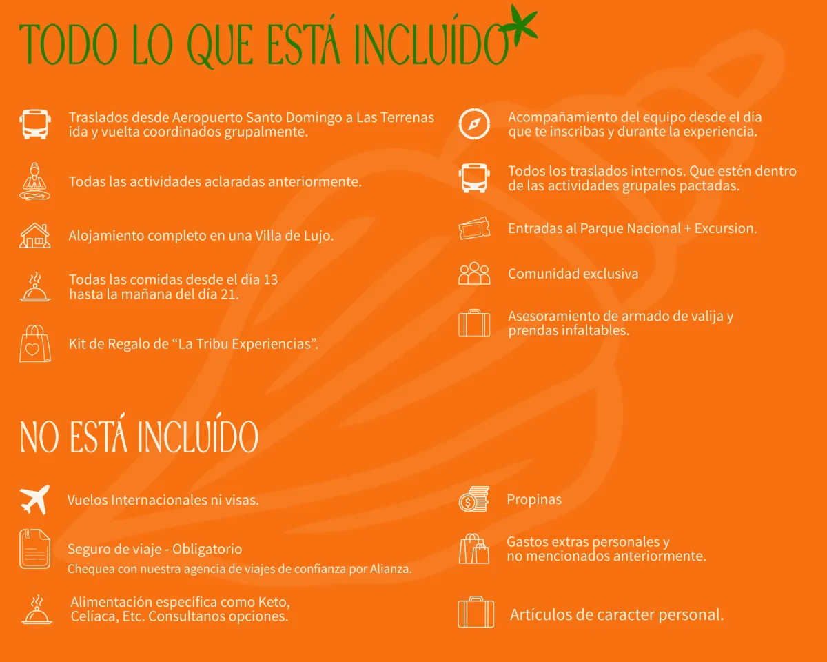 Desde cualquier parte del mundo. Cada viajera es responsable de llegar a nuestro punto de encuentro, Aeropuerto de Santo Domingo, y ahí comienza nuestra aventura juntas. Incluye traslado grupal desde el aeropuerto que será coordinado en base a los horarios de llegada de todas, en 2 turnos, mañana y tarde. (Recorda: nosotras podemos ayudarte a encontrar las mejores opciones de vuelos a través de nuestra agencia amiga)